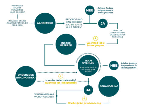 Zij verwijzen je door naar De Hoop. In deze verwijzing staan jouw gegevens en een omschrijving van de hulp die je nodig hebt. Nadat De Hoop een verwijzing heeft ontvangen, krijg je een e-mail met de vraag om een online aanmeldformulier in te vullen. Pas als je deze hebt ingevuld en opgestuurd ben je bij De Hoop aangemeld.