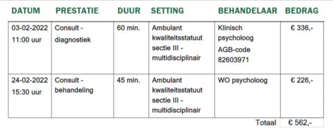In dit overzicht staat wat je behandelaar heeft gedaan in jouw behandeling. Dat noemen ze prestaties. Voordelen hiervan zijn dat je sneller weet hoeveel jouw zorg kost en hoeveel eigen risico je moet betalen.